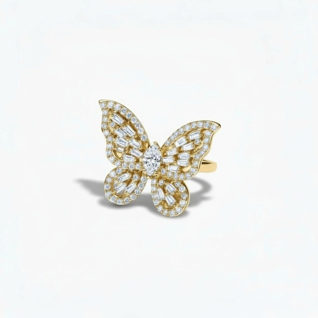 しなやかに、そして確かに進み続ける女性へ。 変容と飛躍を象徴するバタフライをモチーフに、上質なゴールドと3種のダイヤモンドカットを贅沢に組み合わせたリングです。 マーキス、バゲット、ブリリアント―― それぞれ異なる輝きが織りなす立体的な表情は、控えめでありながら確かな存在感を放ち、指先に知的な華やぎを添えます。 仕事にも人生にも妥協しない大人の女性にふさわしい、洗練されたデザイン。 日常の装いに品格を与え、節目の瞬間には自分自身を称えるジュエリーとして寄り添います。 流行に左右されず、長く愛せる一本をお探しの方へ。
