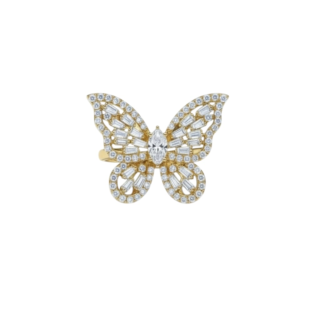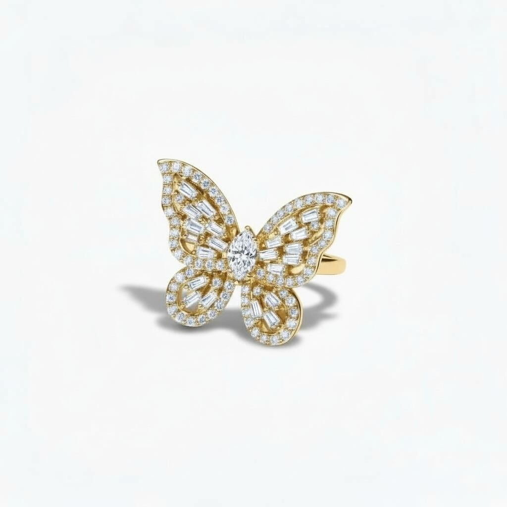 変容と飛躍を象徴するバタフライをモチーフに、上質なゴールドと3種のダイヤモンドカットを贅沢に組み合わせたリングです。