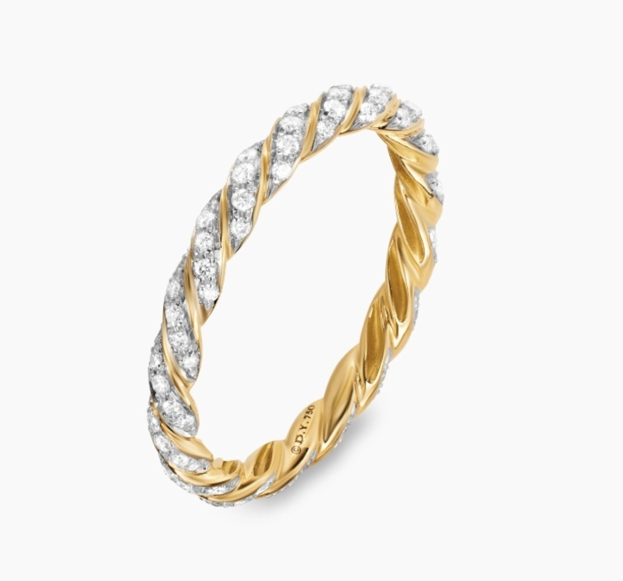 18Kイエローゴールドのなめらかな光沢と、ダイヤモンドを連ねたツイストデザイン。