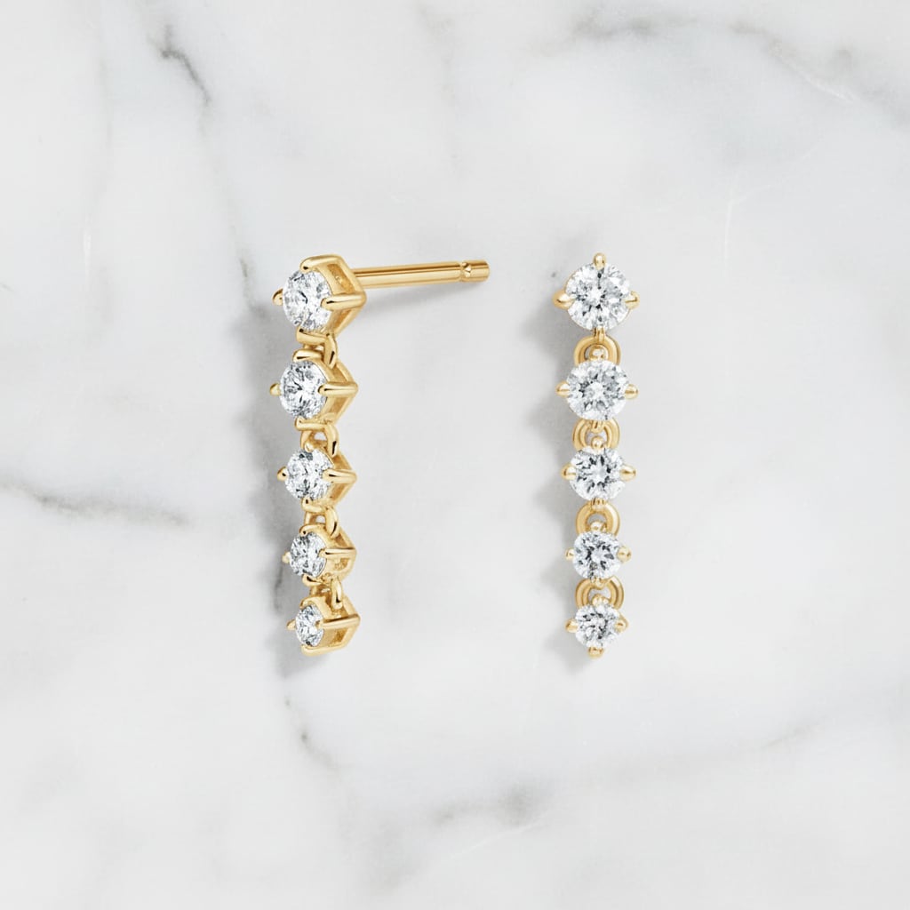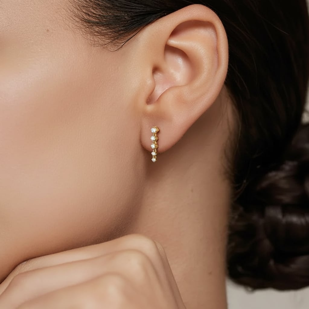 縦一列に輝く5石のクリアストーンが、顔周りをシャープに引き締め、プロフェッショナルな印象を与えます。温かみのあるイエローゴールドがビジネスシーンに適度な華やかさをプラス。フォーマルからカジュアルまで、どんな装いにも自然に溶け込み、あなたの魅力を引き立てます。